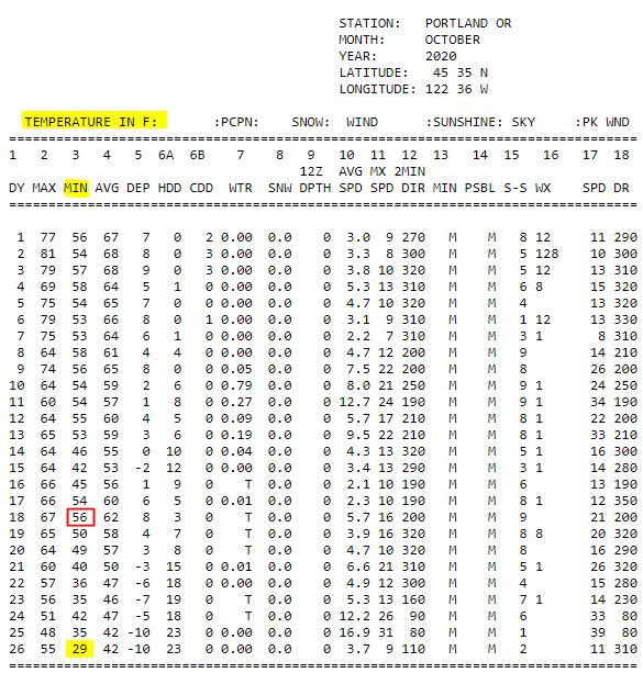 Let’s take a look at the month of October 2020 with the observation chart from the National Weather Service in Portland, Oregon. A comparison from the morning of October 18 to October 26 is found below. One morning came in with a low of 56 and the other a record low of 29 degrees. In about the span of a week, we had a morning low in the mid 50s and one all the way down to the upper 20s. What is the deal with that? Then in between, we have many other morning temperatures in the 40s. How do we end up with one warmer and the other cold?